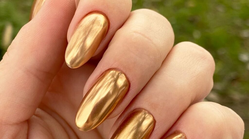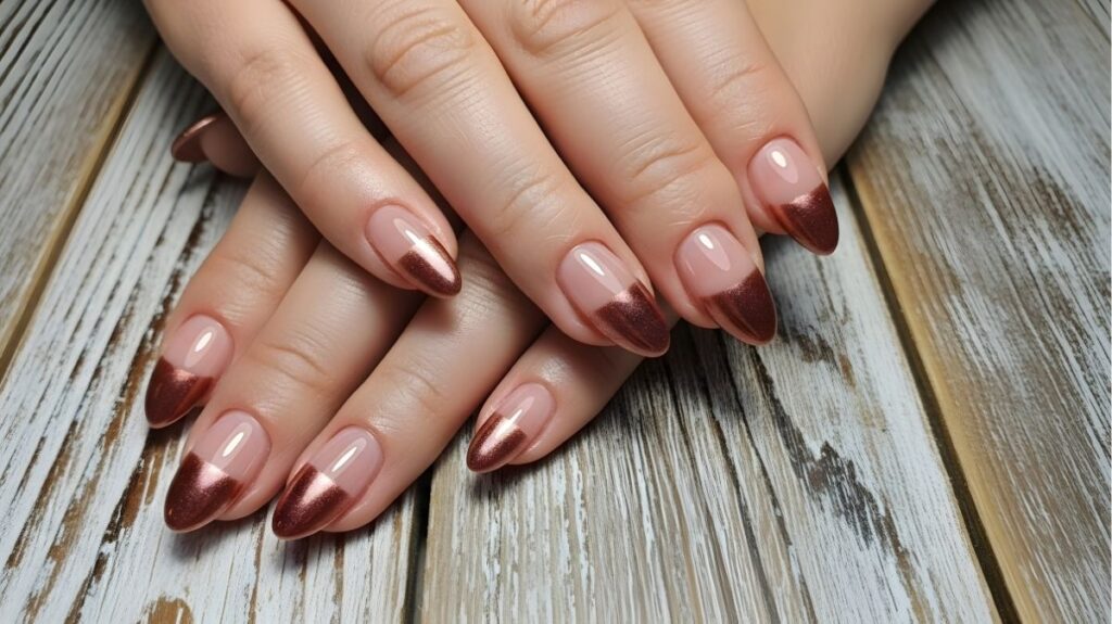 Shiny, bold, and full of autumn glow — copper chrome nails are pure fire this season. The metallic sheen reflects the golden hour light beautifully. You can go full metallic or pair it with nude accent nails for contrast. This look is perfect for night events or when you want to make a statement. Keep the nail shape almond or coffin for a sleek, high-fashion edge.