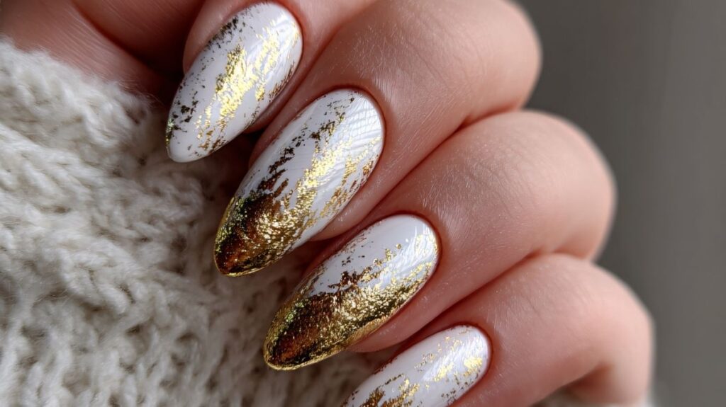 Gold foil nails are the definition of fall luxury. Start with a neutral base like beige, taupe, or soft pink, then gently press gold foil pieces on top. The irregular texture gives a golden-leaf effect, perfect for autumn aesthetics. It’s elegant enough for formal events yet simple enough for everyday wear. Combine it with warm brown or burgundy shades for an elevated finish.